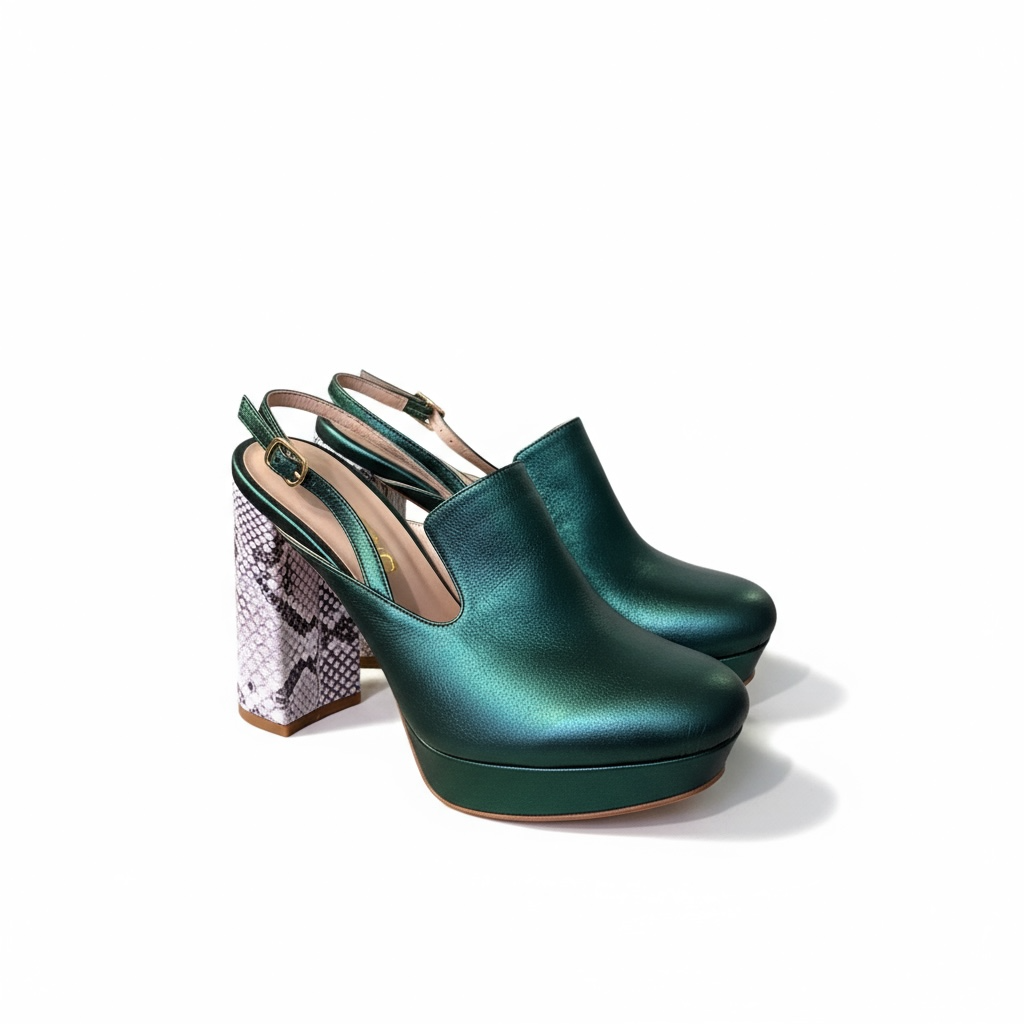 Estos zapatos zuecos verdes están confeccionados en cuero vacuno y tienen un elegante y distintivo taco pitón de 12cm de altura, con una plataforma de 3cm. Brindan un toque de cuero y elegancia a cualquier atuendo. ¡Atrévete a lucir sofisticada y cómoda con estos zuecos!